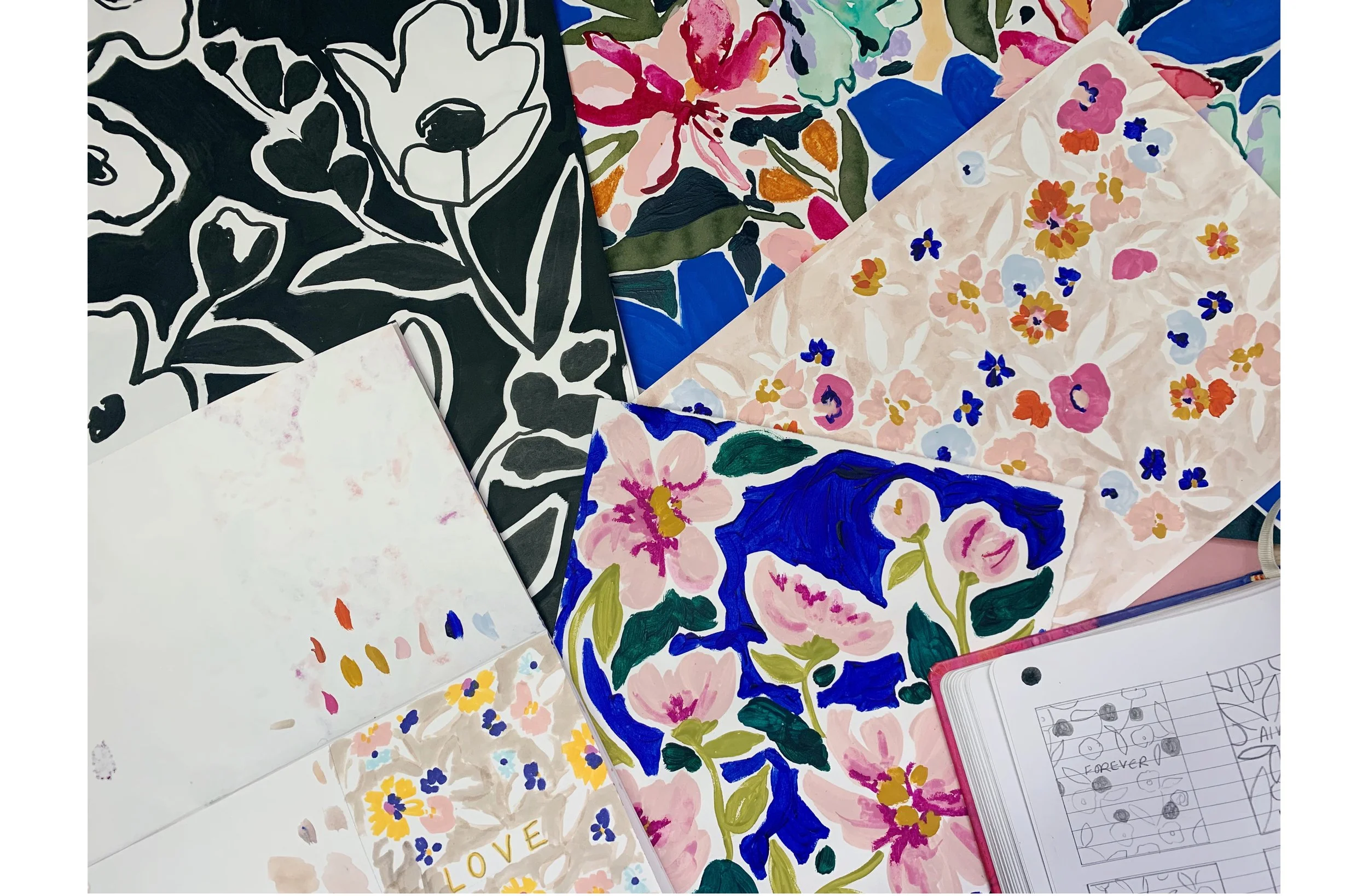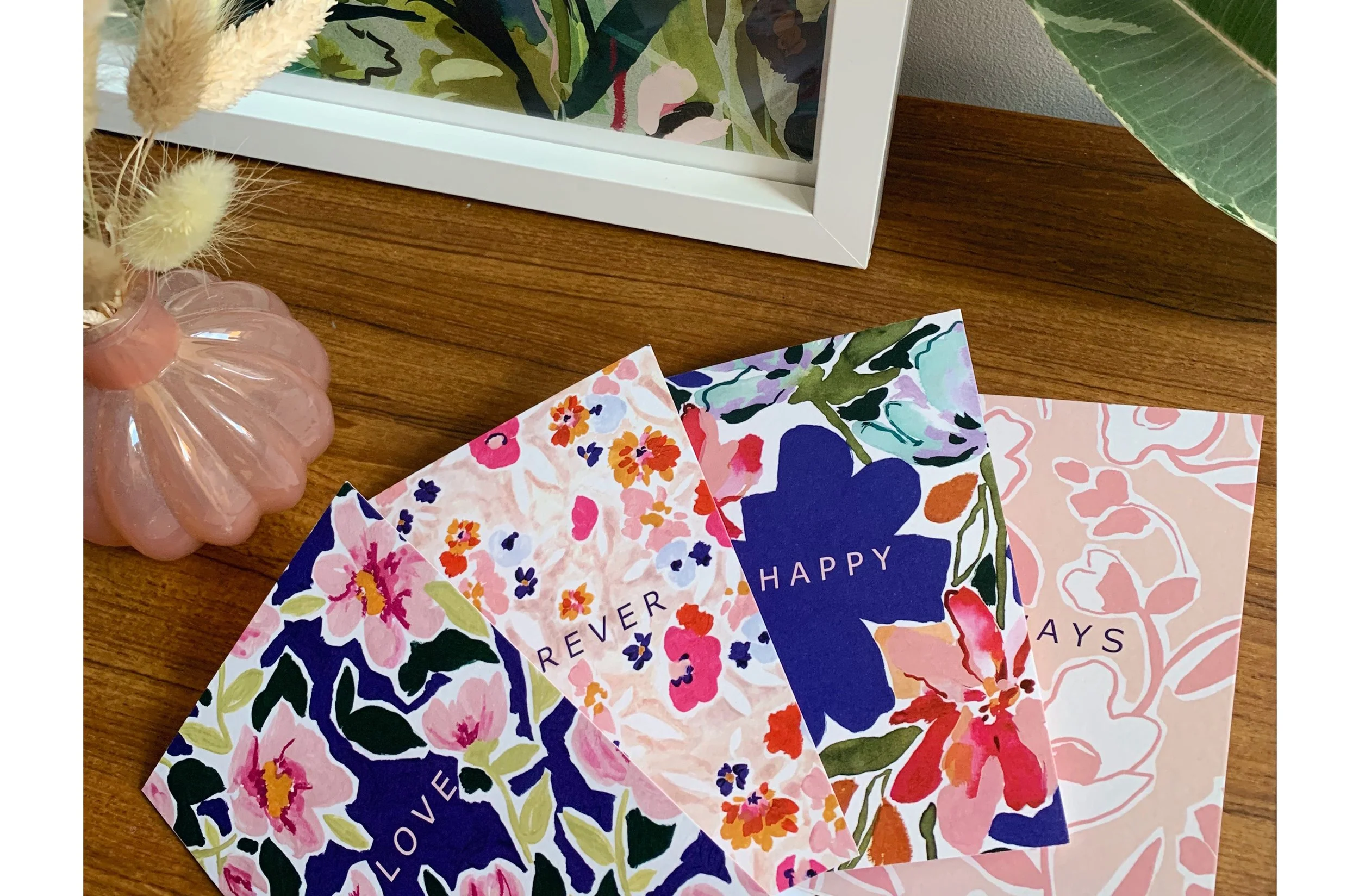 My first thought was that I knew I wanted these cards to be positive and uplifting, so naturally my source of inspiration was florals as this is a universal element that brings many of us joy. I hand painted the designs and using vibrant colours created 4 different designs to work together as a collection.